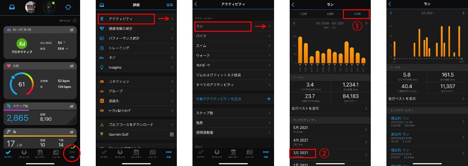 「マイデイ」画面の詳細 → アクティビティ → ラン → ①1年間 → ②見たい月