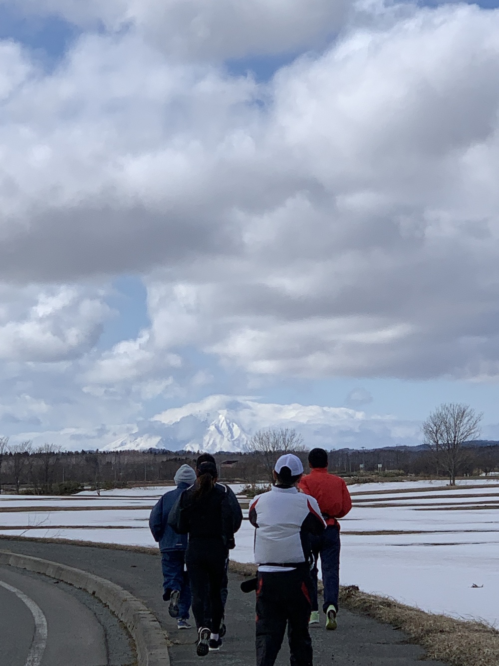 平日の朝ランのコースの1つ。復路での道路の先に見える利尻富士が毎年6月上旬に開催される利尻島一周マラソン「利尻周遊覧人G(53.5km)」に向けてガンバろうという気にさせてくれる。ずっと歩道を走ってたどり着けるので安全。