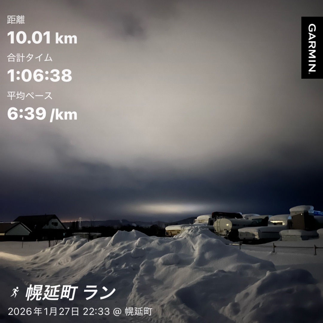 トライアスロントライアスロン カテゴリーを選択 Garmin・データ設定 ダイエット 暮らし・生活 未分類 観光・温泉 運動・トレーニング 夜ラン10km(-7℃) 運動・トレーニング X Facebook はてブ LINE コピー 2026.01.29 この記事は約1分で読めます。 2026.01.27 Tue. ちょっと遅い時間からスタートして、町内一周と枝道で10kmラン。 距離:10.01km 時間:1:06:38 ペース:6:39/km 晴れていたので、静かな時間・静かな景色でした。 枝道から見た町 月と雲がキレイ