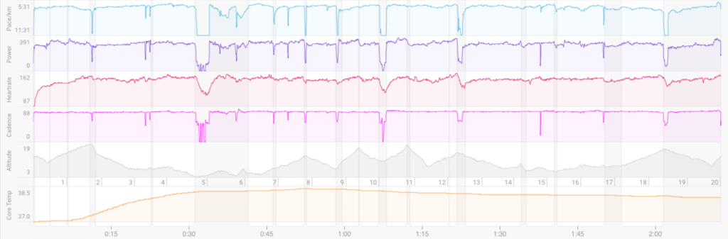 タイムが落ち込んでいるのは、折り返すところで滑ってコケるのを避けるために歩いているところと歩いた後、復活するまでの時間です(苦笑)